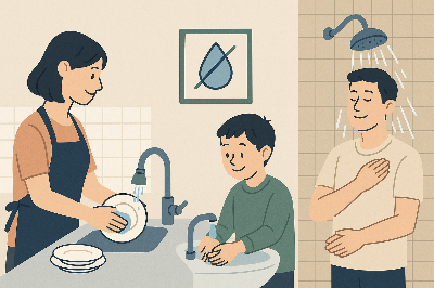 평균적으로 10분간 샤워하면 약 100리터의 물이 소비됩니다. 샤워 시간을 2~3분만 줄여도 큰 효과를 볼 수 있습니다. 물을 틀어놓은 상태에서 머리를 감거나 양치하는 습관은 개선하는 것이 좋습니다.